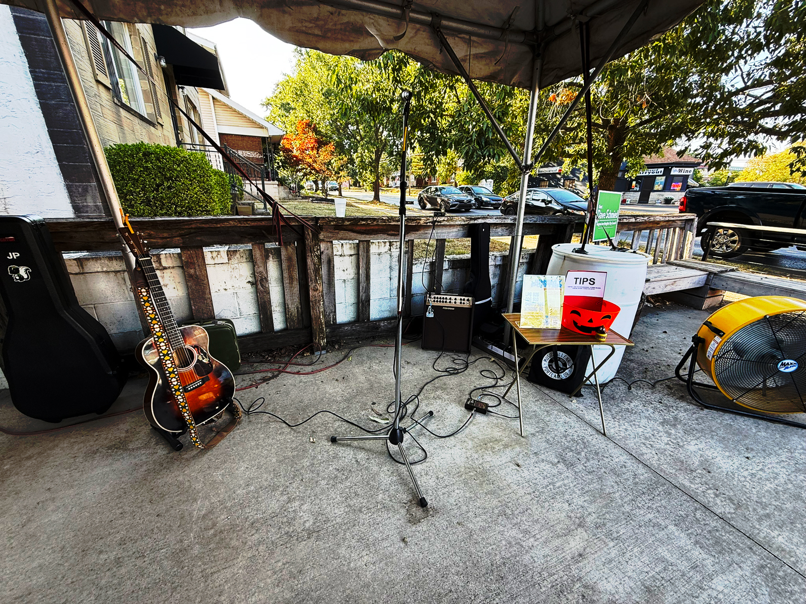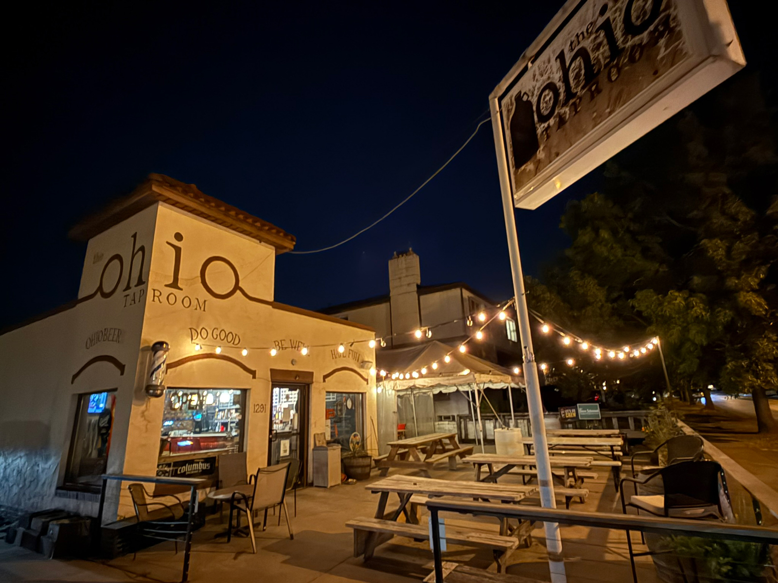 I checked into my motel on the south side of Columbus and got caught up with all the action on my phone that I’d missed over the last three hours and chilled out for a few minutes before I had to get into my show headspace and head back into the city. It was an easy 15 minutes to the venue where I met the owner John and loaded in. The Ohio Taproom sits on a busy intersection on the north side downtown Columbus with lots of walking traffic and other bars around. It’s a former barber shop, I assume, based on the aged barber shop pole still attached to the building by the front entrance. The patio where I played was out front, and there’s a cozy taproom inside with an amazing beer selection and a few boutique liquors too.