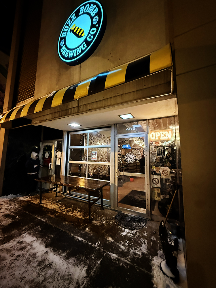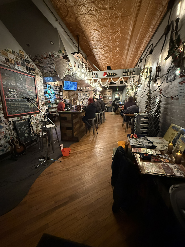 Downtown Springfield was buried in snow and there was barely a car in sight. The plows were out as well as the sidewalk sweepers, but I knew I was going to be in for a slow night, as I questioned my logic when I defiantly said I was braving the weather 7 hours earlier. Buzz Bomb Brewing Company is in the city center, a couple blocks from the mocktail bar I played last spring and the old state-house, where Abraham Lincoln gave his “House Divided” speech in 1858. It’s a small brewpub with a bar and a couple high-tops, and a spot for a solo artist near the front door. By now it was a frigid 3F, and I had to shovel a path from the sidewalk to the back of my truck to load in.